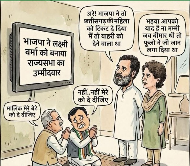 BJP vs Congress : रायपुर | 7 मार्च 2026: छत्तीसगढ़ के सियासी अखाड़ा में राज्यसभा चुनाव ला लेके घमासान मच गे हे। भाजपा ह एक अइसन पोस्टर जारी करे हे, जेखर ले कांग्रेस के भीतर खलबली मच गे हे। ये पोस्टर में राज्यसभा प्रत्याशी चयन ला लेके सीधा तंज कसे गे हे कि कांग्रेस में मेहनत नई, बल्कि ‘गांधी परिवार के सेवा’ के आधार ऊपर टिकट मिलथे।