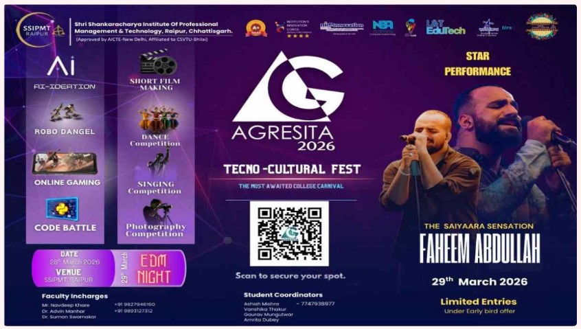 SSIPMT रायपुर मा 28-29 मार्च के होही ‘अग्रसित’ टेक्नो-कल्चरल फेस्ट, एआई ले लेके नाच-गाना तक दिखही लइका मन के टैलेंट